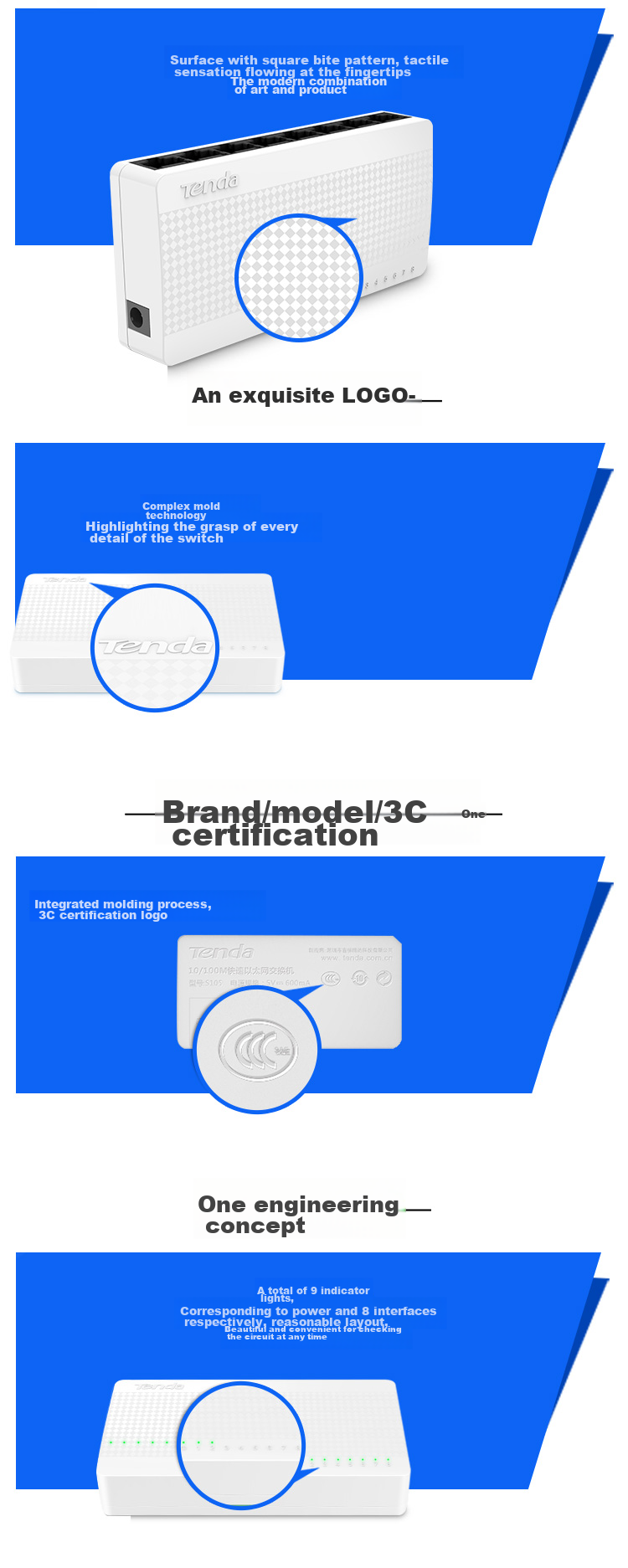 **Indicators:** 9 LED indicators, including power and 8 interface indicators, for easy monitoring and aesthetically pleasing layout.