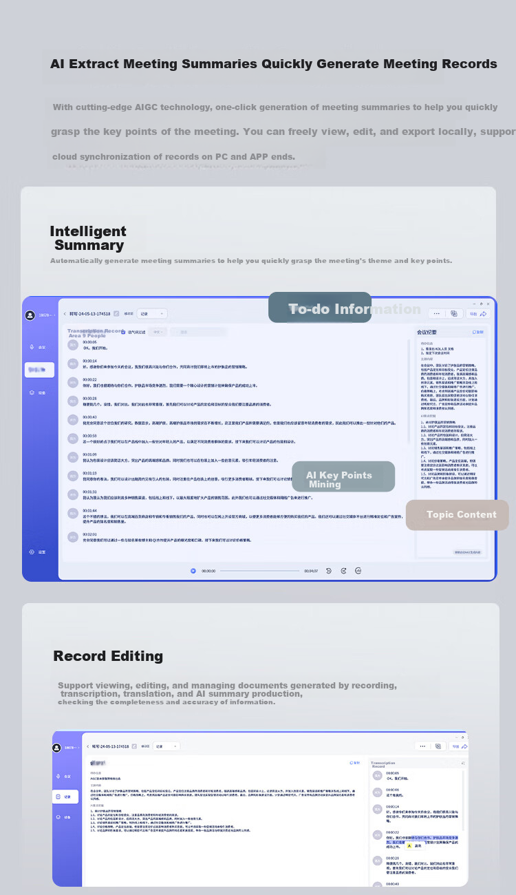 - Transcription of up to 9 people, AI point extraction, topic content recording, and document editing.