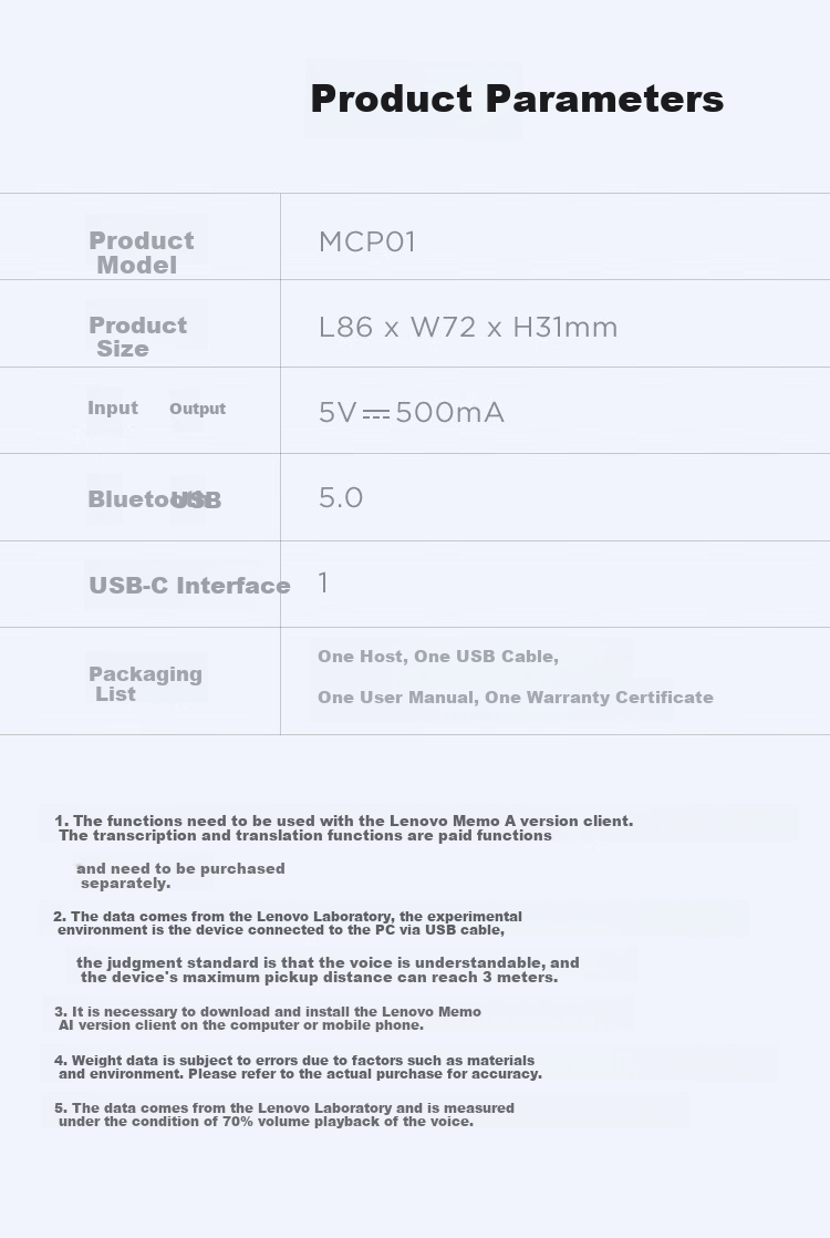 - Lightweight and portable with AI summary generation, recording, transcription, translation, 360° sound pickup, intelligent noise reduction, voice optimization, mute button, dual connectivity, and wide compatibility.