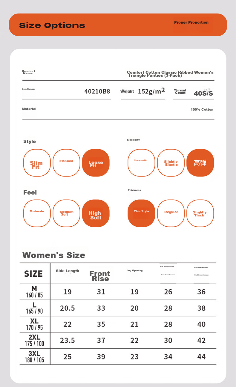 **Product Details:** The elastic waistband and stretchy leg openings ensure a comfortable fit without any restrictions. The panties come in various sizes and colors, with a weight of 152g/m2 and a thread count of 40S.