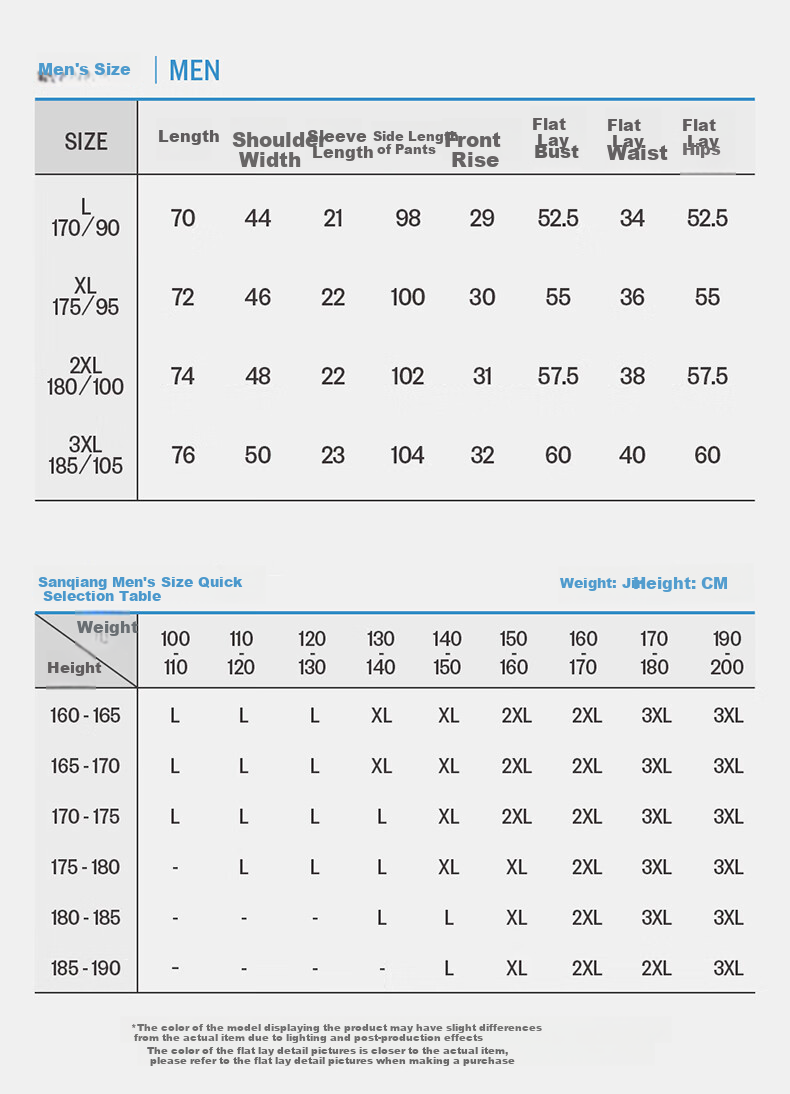 - L: Length 70cm, Shoulder 44cm, Sleeve Length 21cm, Pant Side Length 98cm, Front Rise 29cm, Chest 52.5cm, Waist 34cm, Hip 52.5cm, 170/90