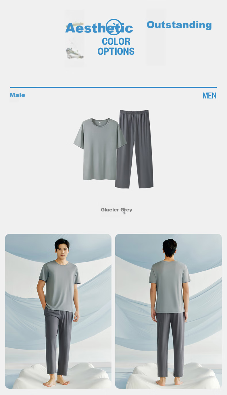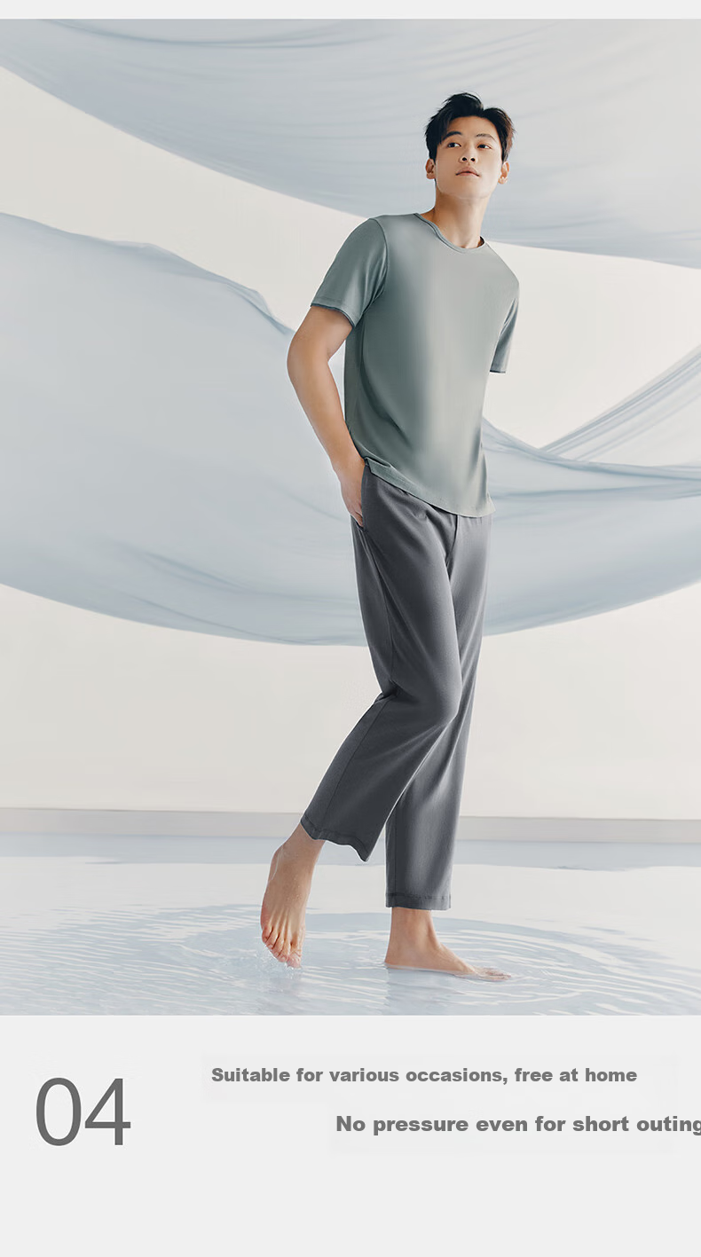 Product Name: Ice Spring Soft Cotton Hidden Striped Round Neck Short Sleeve Long Pants Men's Home Suit