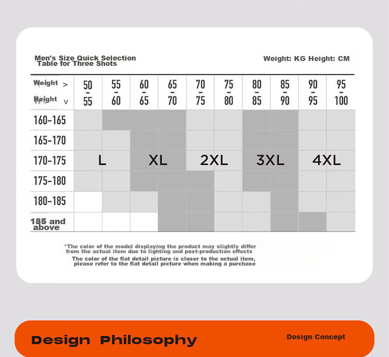 **Size Chart for Men:** Select size based on weight (KG) and height (CM).