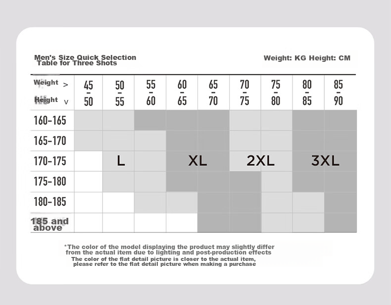 - Height: V, 50, 160-165, 165-170, 170-175, L, XL, 2XL, 3XL, 175-180, 180-185, 185 and above