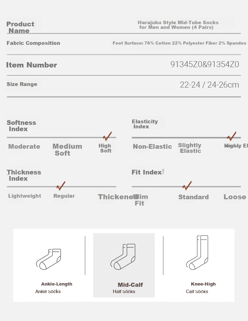 **Product Name:** Harajuku Style Mid-Calf Socks (4 pairs)
