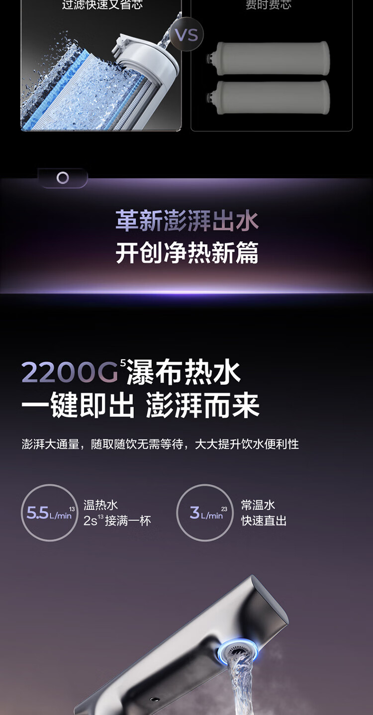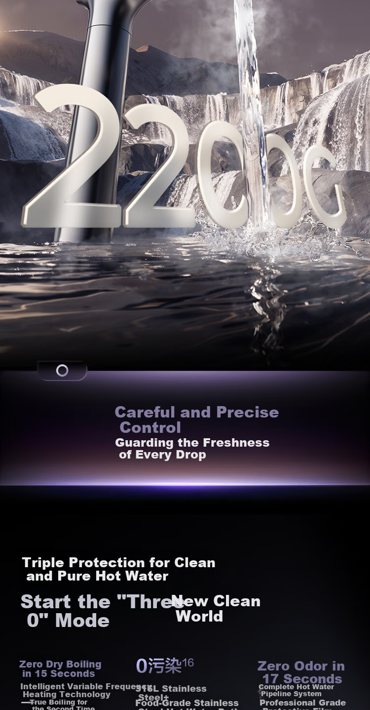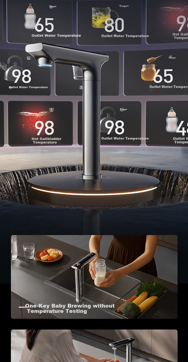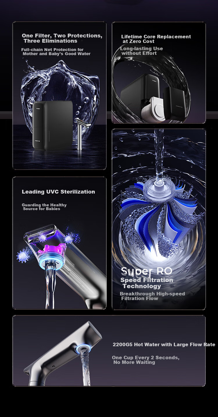 - Long-lasting filter, UVC sterilization, and rapid hot water dispensing