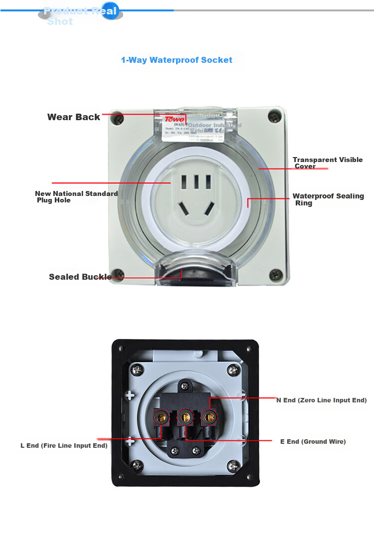 Features: Transparent visible cover, new national standard socket holes, waterproof sealing ring, sealed buckle