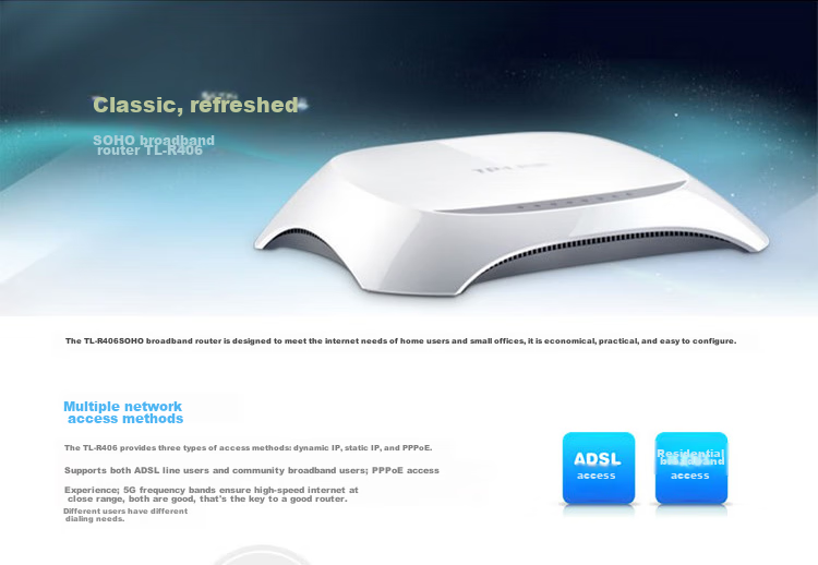 **Description:** Classic yet refreshed, the SOHO broadband router TL-R406 from TP-LINK is designed to meet the internet needs of home users and small offices. It is economical, practical, and easy to configure.