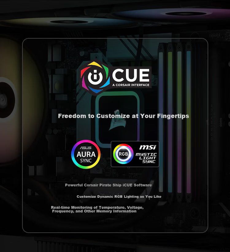 Customization: Compatible with CORSAIR iCUE software for dynamic RGB lighting customization and real-time monitoring of temperature, voltage, and frequency
