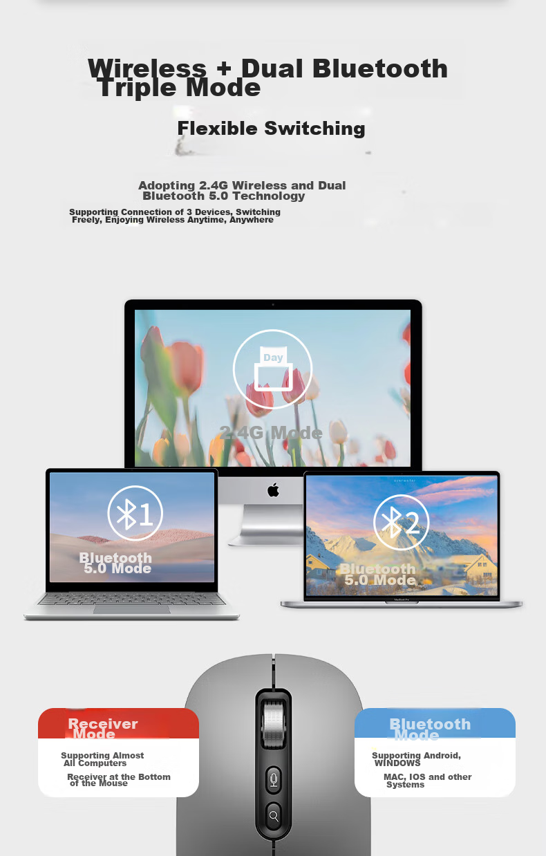 - Wireless dual Bluetooth triple mode with 2.4G wireless and dual Bluetooth 5.0 technology