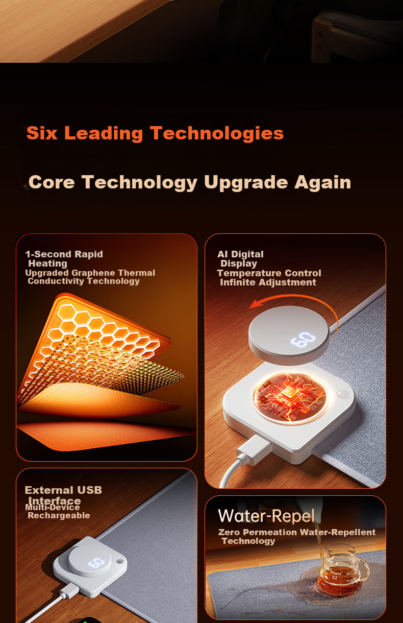 - Advanced technologies: 1-second rapid heating, AI digital display, upgraded graphene thermal conductivity technology, continuous temperature control, external USB interface for multi-device charging, Water-Repel technology