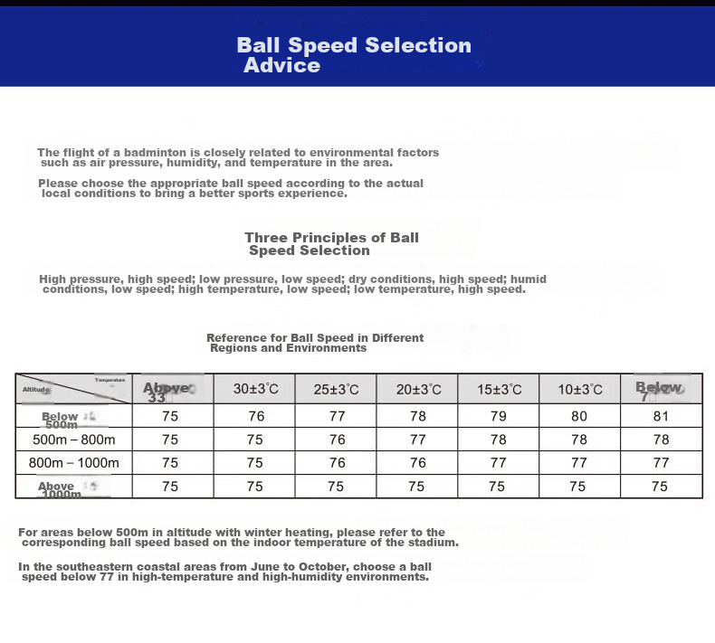 **Note:** The speed recommendations are based on altitude, temperature, and humidity levels, ensuring a suitable shuttlecock speed selection for different playing conditions.