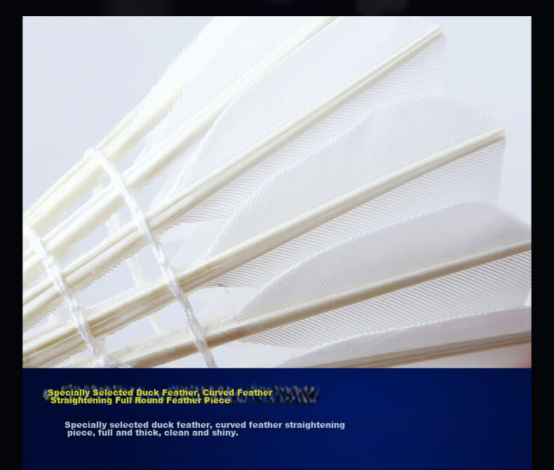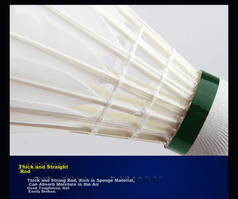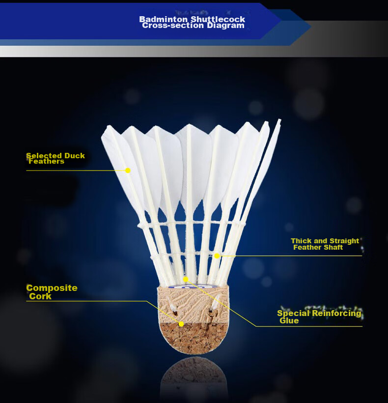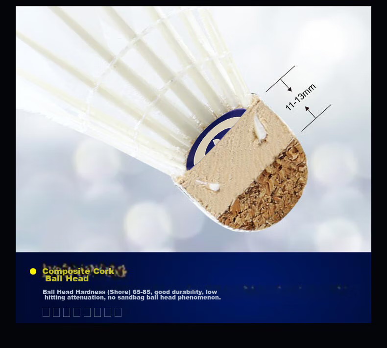 The shuttlecock's feather shaft is thick and straight, while the composite cork head has a hardness rating (Shore) of 65-85.