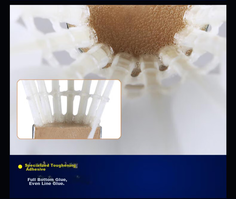 The shuttlecock is equipped with a special adhesive for added resilience and longevity.