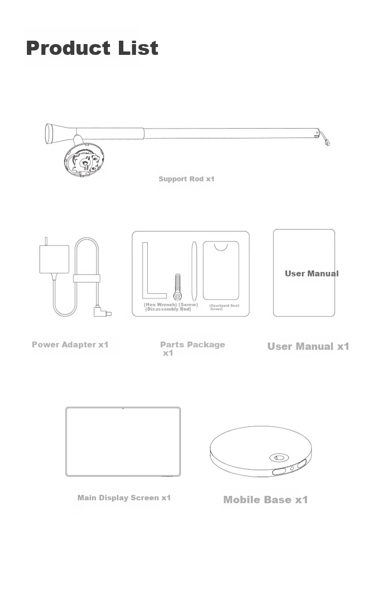 **In the Box:** Support stand, user manual, hex key, screws, power adapter, parts kit, display screen, mobile base