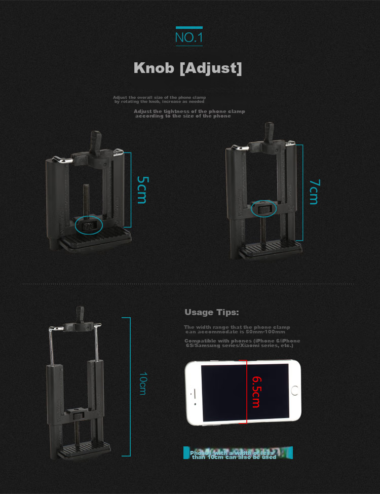 1. **Adjustment Knob:** Rotate the knob to adjust the overall size of the phone clamp, accommodating phones with widths ranging from 50mm to 100mm. Suitable for phones such as iPhone 6/6S, Samsung series, Xiaomi series, etc.