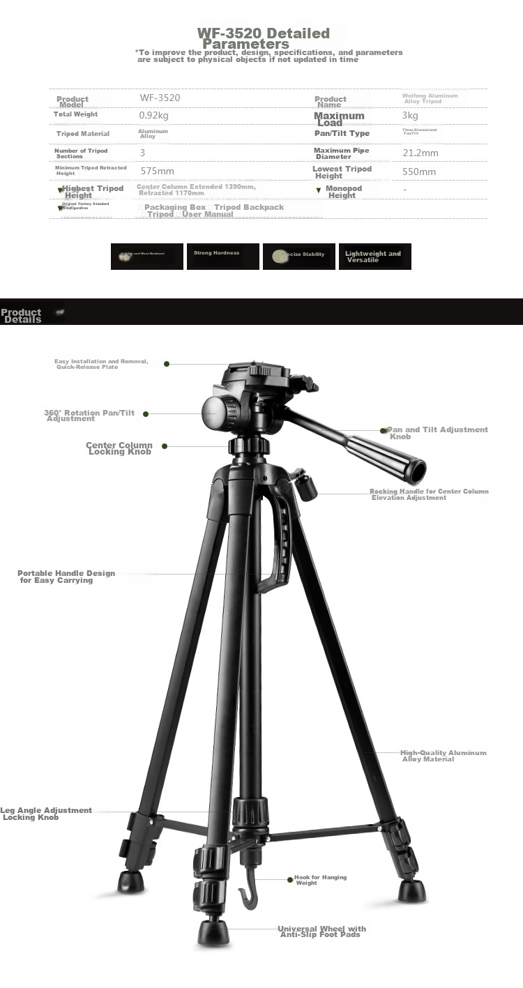 **Official Package Includes:** Packaging box, tripod backpack, tripod, user manual