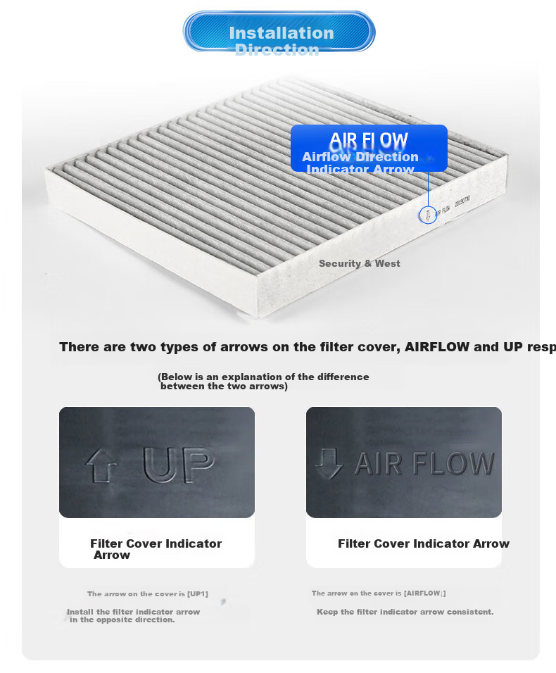 **Installation Direction:** Air flow indicated by arrows on the filter cover