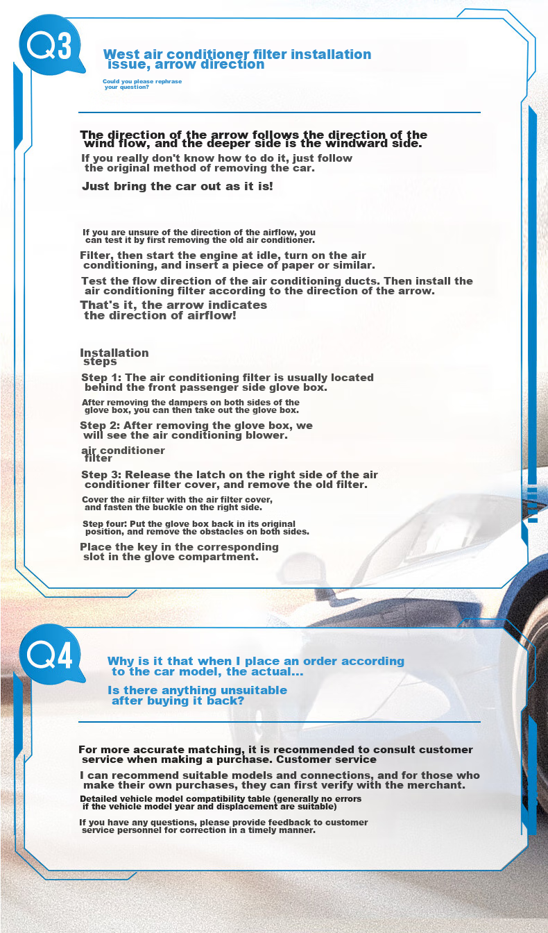 **Common Questions:** FAQs provided for replacement cycles, installation, and airflow direction
