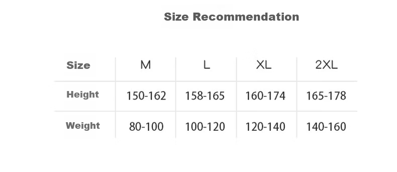 - Height: 150-162cm, 158-165cm, 160-174cm, 165-178cm