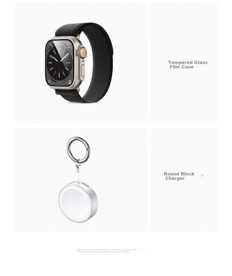 **Accessories:** Includes microcrystalline protective film, tempered glass case, and round block charger