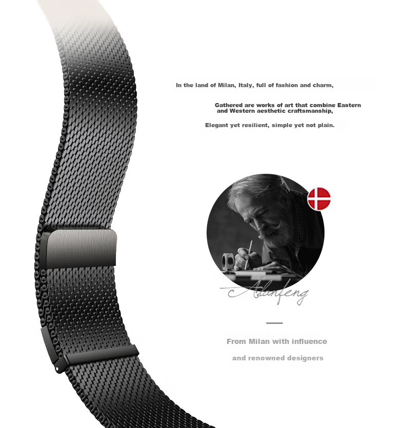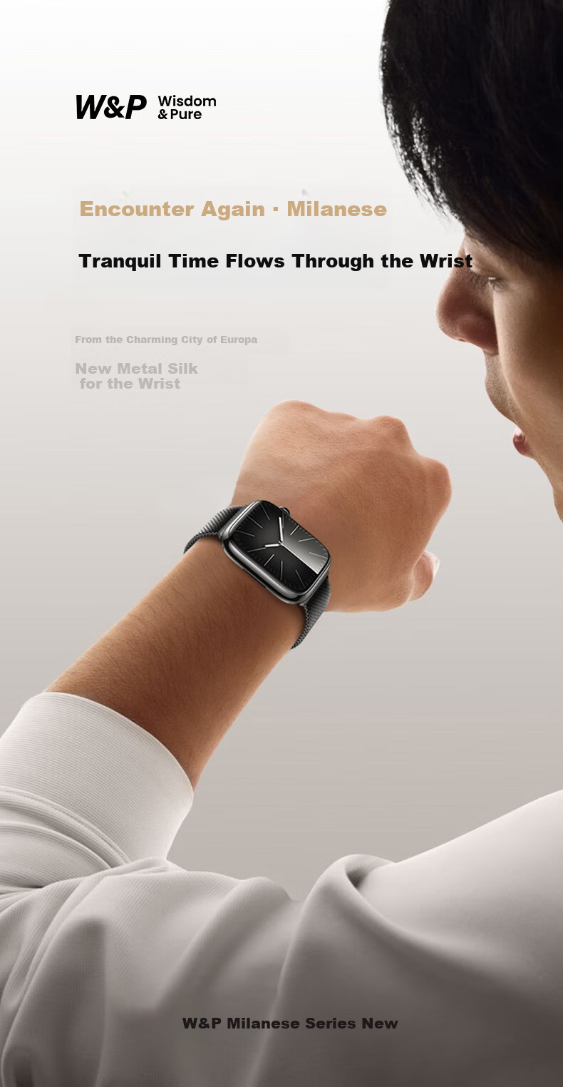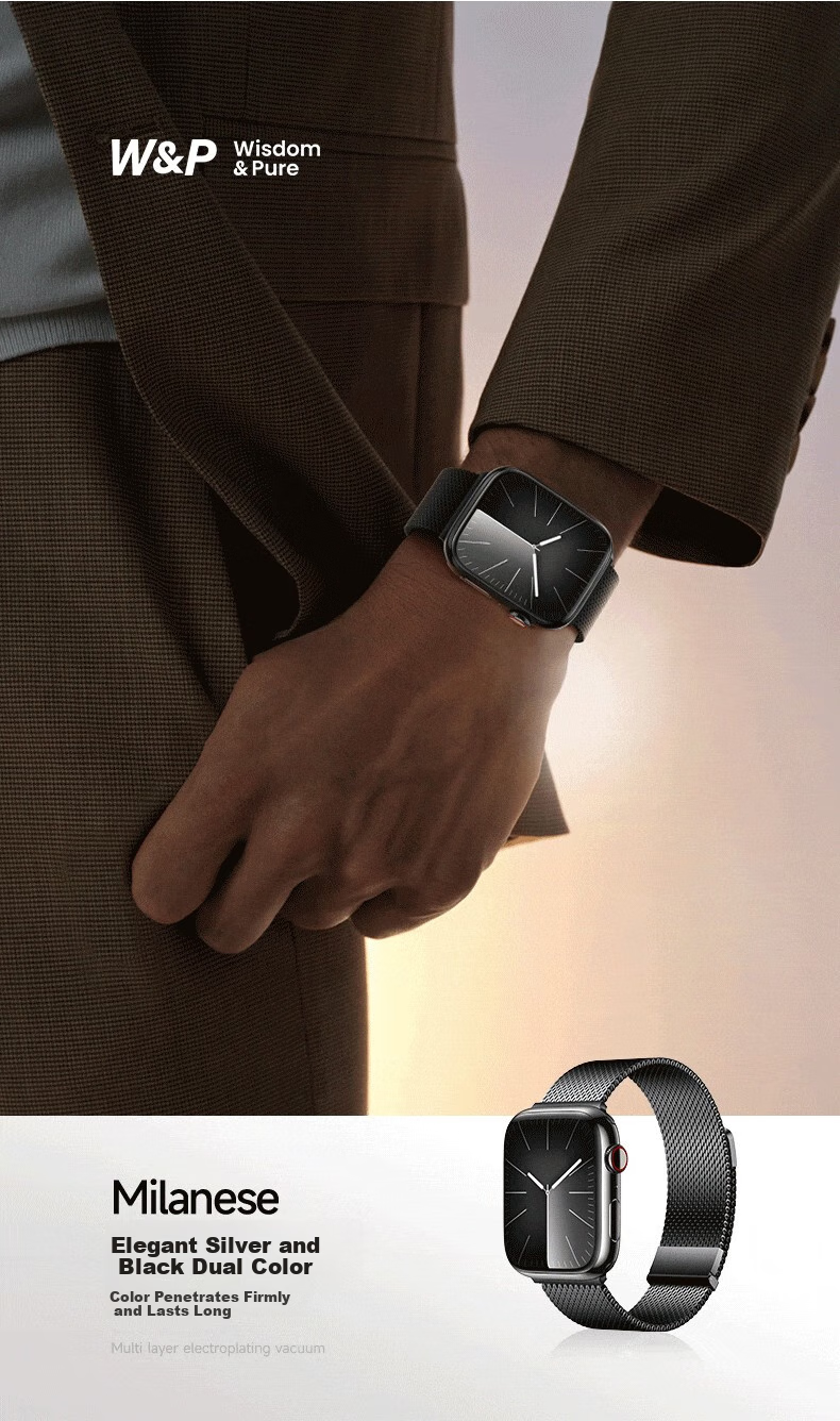 The W&P Milanese series combines the classic Milanese style with modern craftsmanship. The metal silk material and intricate weaving technique provide a comfortable and stylish wearing experience. The dual magnetic absorption design ensures a secure fit and easy adjustability. With advanced ion plating technology, the watch band is scratch-resistant and maintains its color over time. The elegant silver-black color scheme and precise angular shape make this band a fashion statement. Upgrade your style with the W&P Milanese series and experience the perfect blend of tradition and innovation.