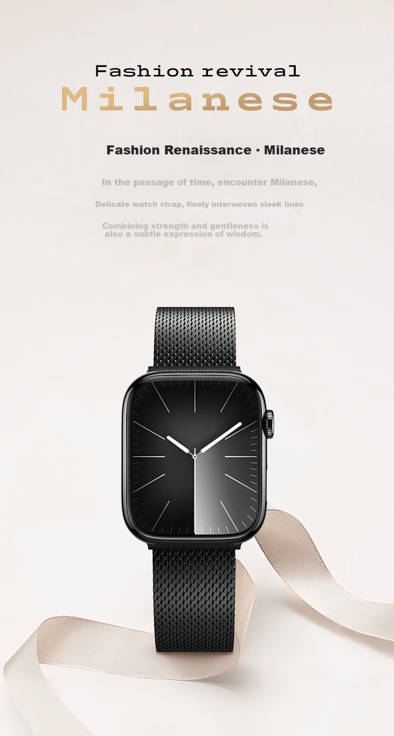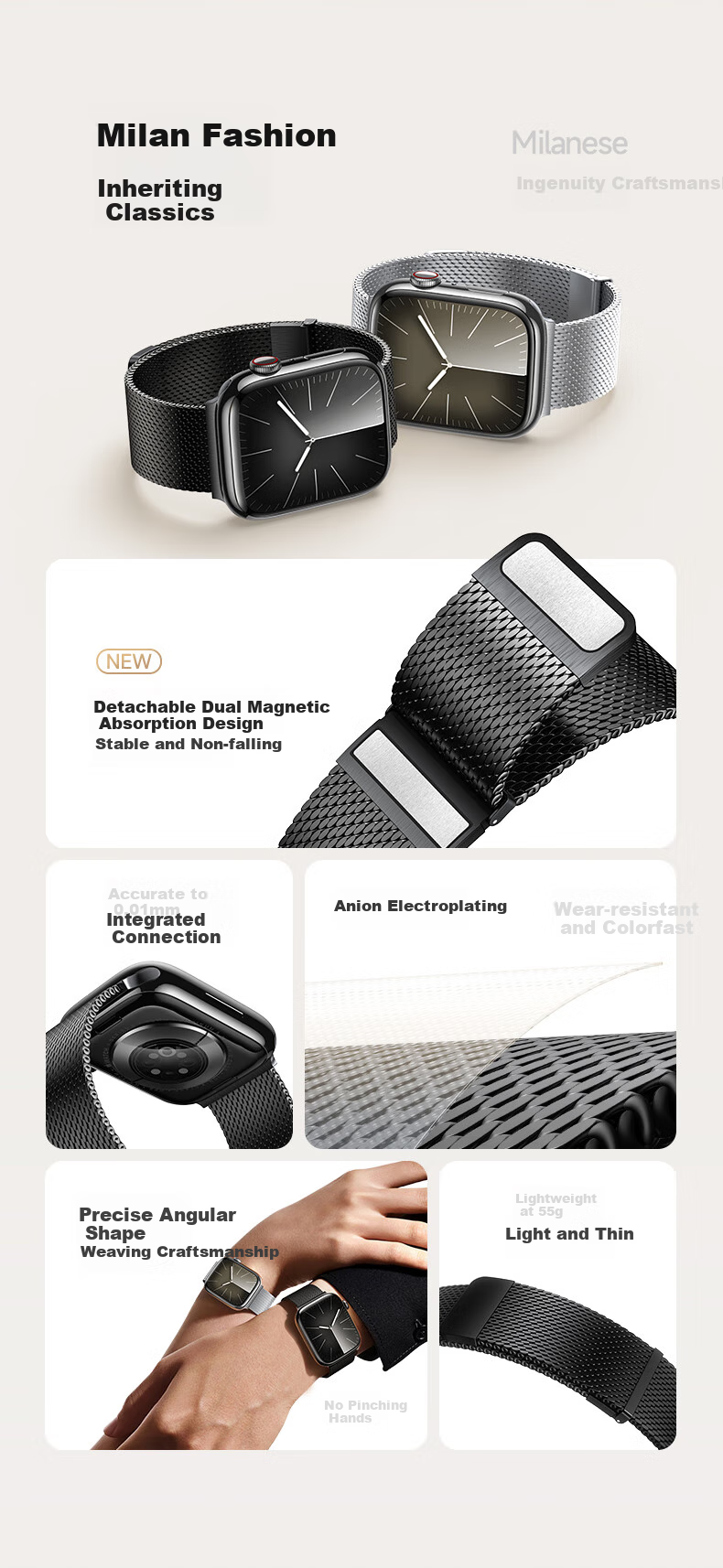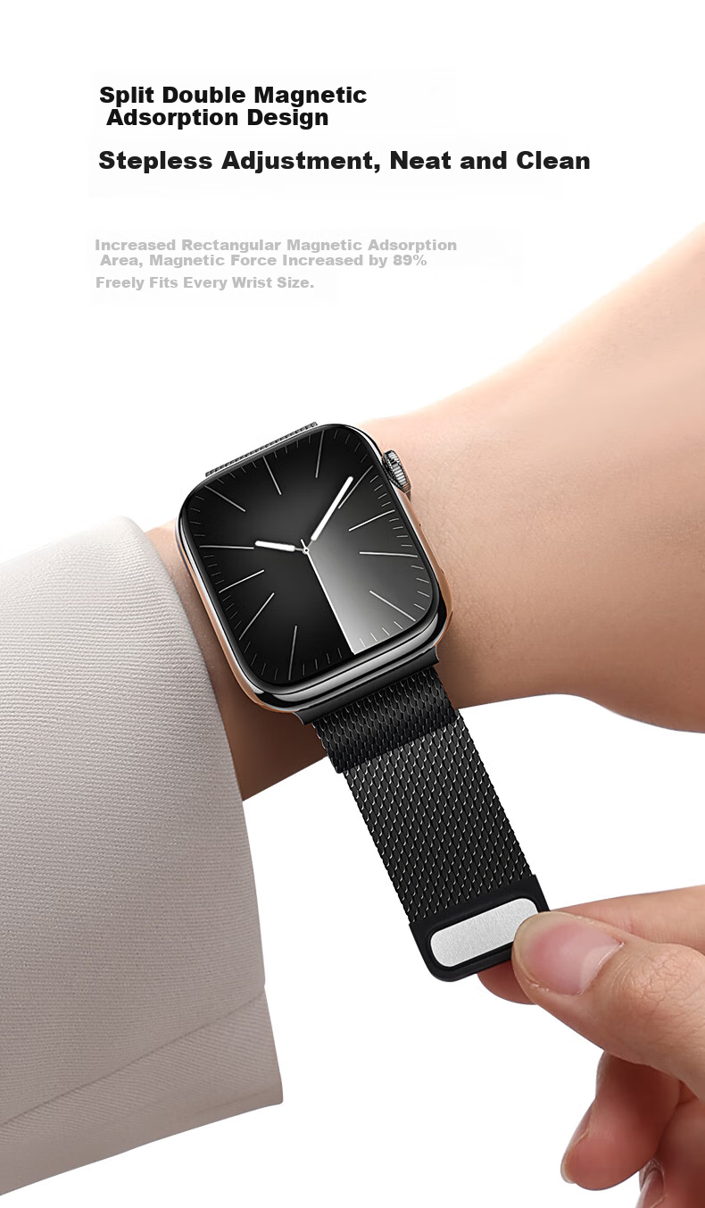 The W&P Milanese series combines the classic Milanese style with modern craftsmanship. The metal silk material and intricate weaving technique provide a comfortable and stylish wearing experience. The dual magnetic absorption design ensures a secure fit and easy adjustability. With advanced ion plating technology, the watch band is scratch-resistant and maintains its color over time. The elegant silver-black color scheme and precise angular shape make this band a fashion statement. Upgrade your style with the W&P Milanese series and experience the perfect blend of tradition and innovation.