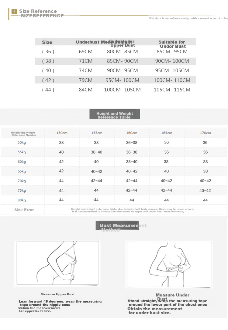 *Note: Measurements and size recommendations may have a 1-2cm normal error due to individual body shapes. It is recommended to choose size based on upper and lower bust measurements. Measurement method for bust size: Measure upper bust with soft tape leaning forward 45° around nipple area, and measure lower bust with soft tape around chest underbust area.*