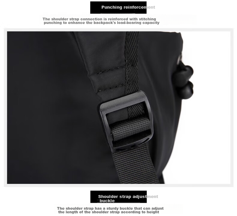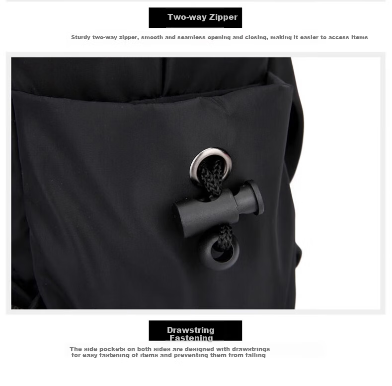 **Details:** Comfortable hand-held woven strap for easy carrying. Reinforced stitching at shoulder strap connections for increased load-bearing capacity. Adjustable shoulder strap buckles for length adjustment. Sturdy double zipper for smooth opening and closing. Drawstring design on side pockets for securing items and preventing them from falling out.