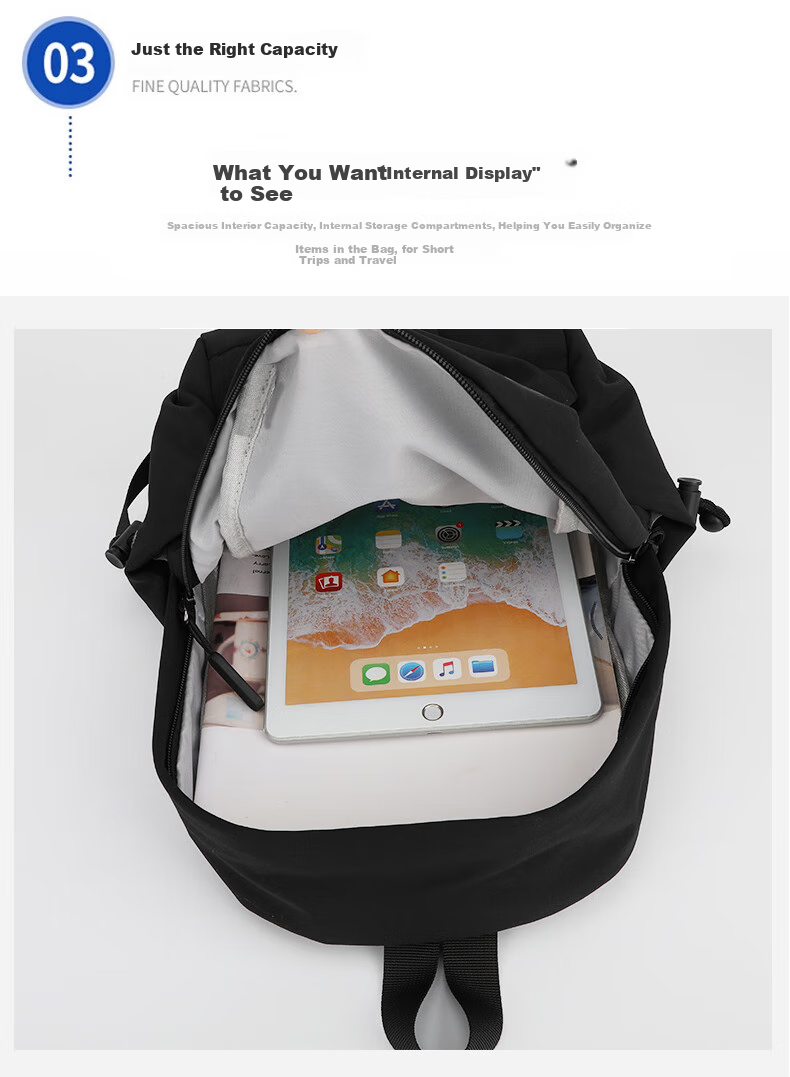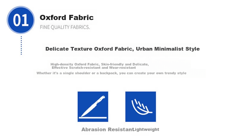 **Material:** Oxford fabric, fine quality fabrics. High-density Oxford fabric with delicate texture, urban minimalist style. Skin-friendly and abrasion-resistant, suitable for both single shoulder and double shoulder carrying. Friction-resistant and lightweight.