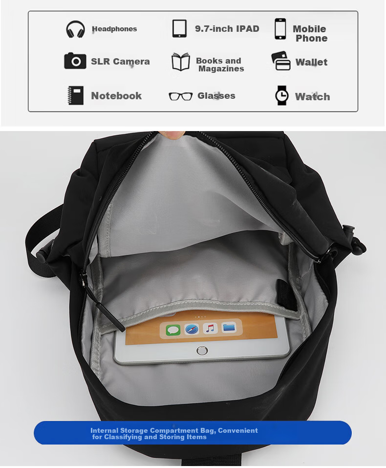 **Capacity:** Spacious interior with storage compartments for easy organization. Suitable for short trips. Internal storage compartments for headphones, 9.7-inch iPad, phone, DSLR camera, books, magazines, wallet, notebook, glasses, watch. Available in beige, black, blue.
