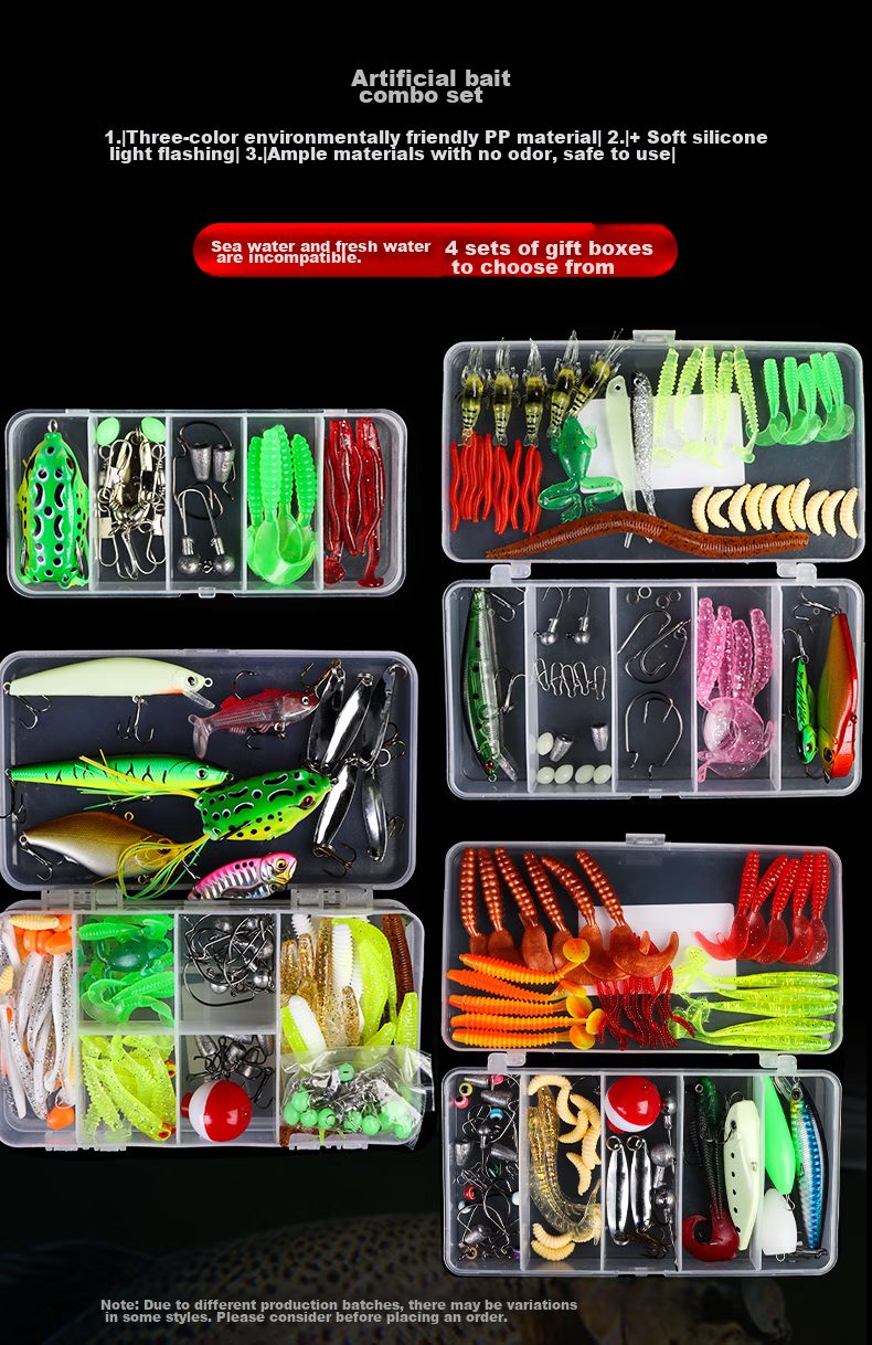 **Product Description:** Artificial bait combination set, specialized for small fish, suitable for both saltwater and freshwater fishing. Available in 4 different set boxes. Note: Variations in styles may exist due to different production batches. Please consider before making a purchase.