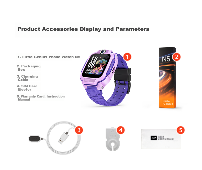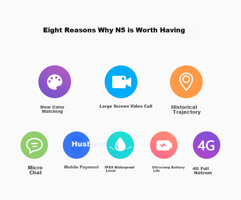 - Eight reasons to own N5: new color options, large screen video calling, historical tracking, 4G connectivity, micro chat, mobile payment, IPX8 waterproof rating, long battery life