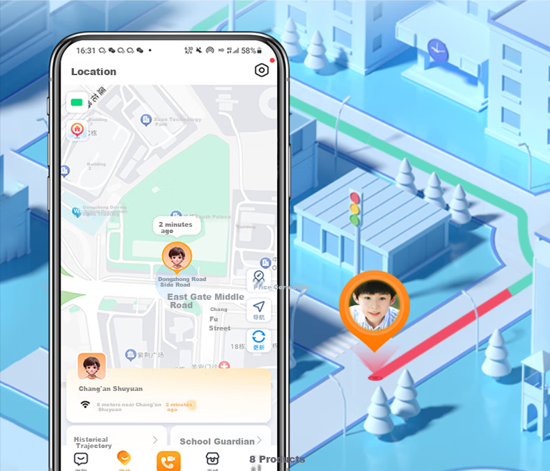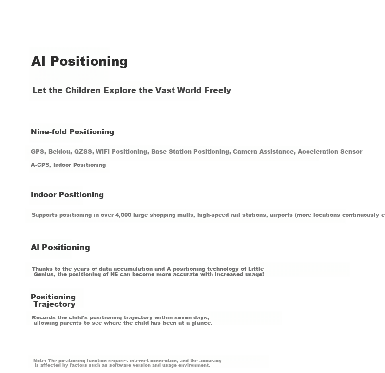 - AI positioning for accurate tracking using GPS, Beidou, QZSS, WiFi, base station, camera assistance, and accelerometer