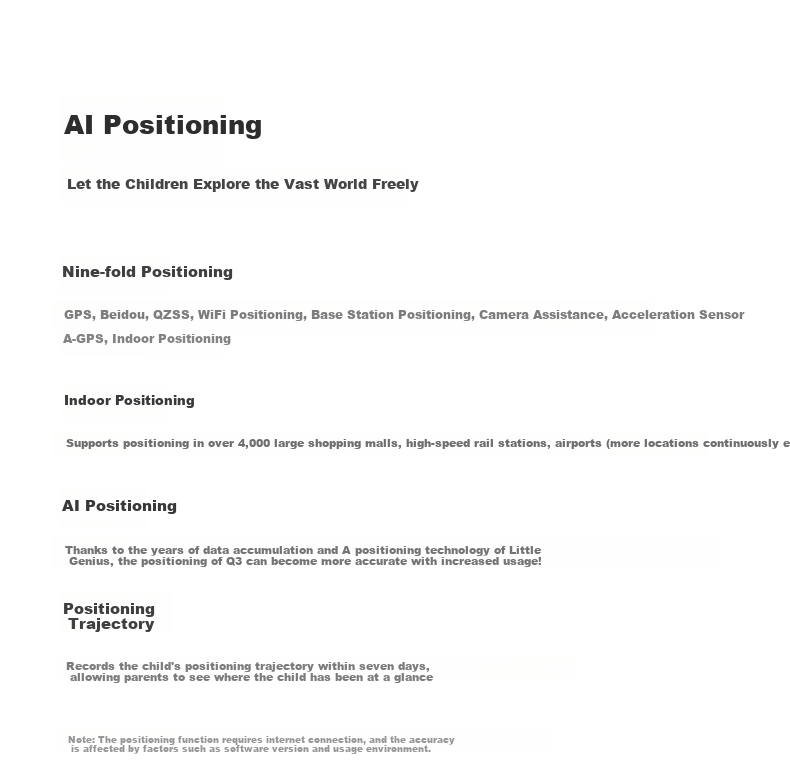- Multi-mode positioning including GPS, Beidou, QZSS, WiFi, base station, camera-assisted, and accelerometer