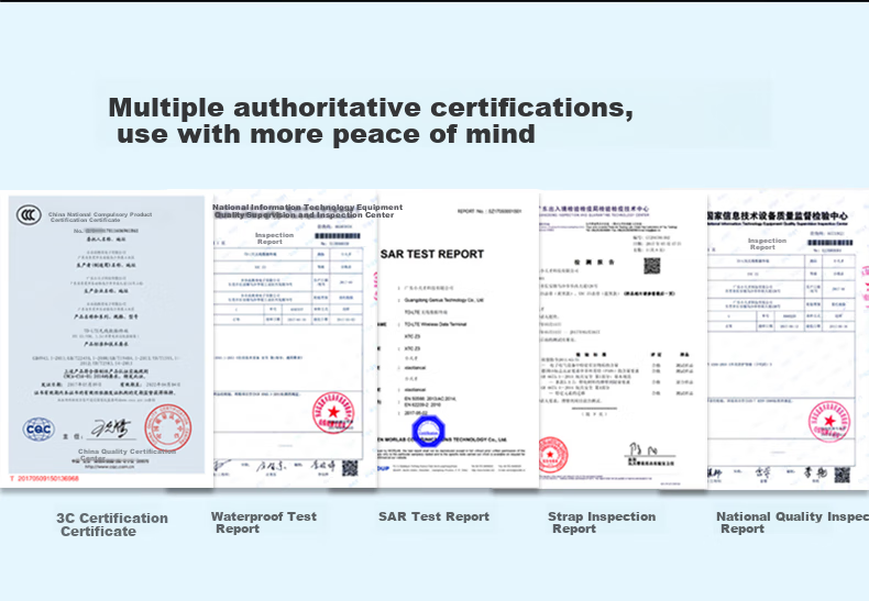 - CCC, SAR, 3C, waterproof testing reports, strap testing reports, national quality inspection reports