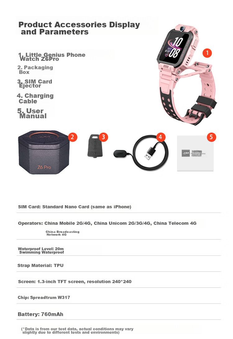 15. Product accessories: Z6Pro smartwatch, packaging box, SIM card ejector, charging cable, user manual