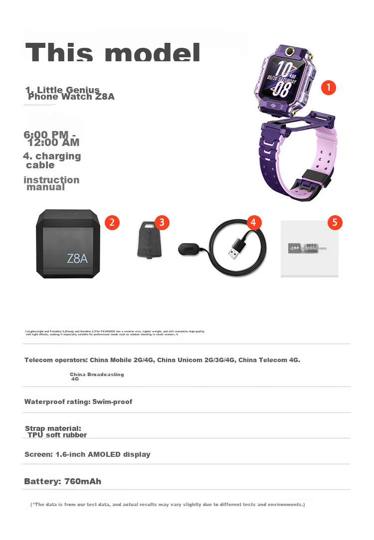 Accessories: phone watch Z8A, packaging box, SIM card ejector, charging cable, user manual