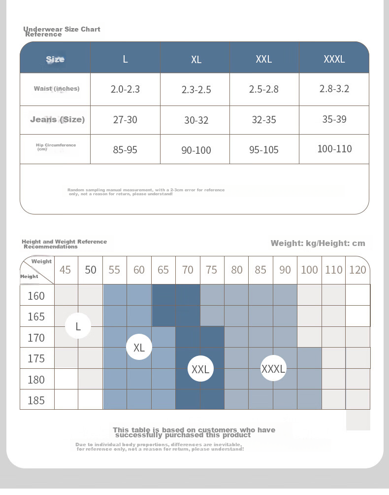 Please note that measurements are based on manual sampling and may have a 2-3cm error. Height and weight recommendations are provided as a reference and may vary based on individual body proportions.