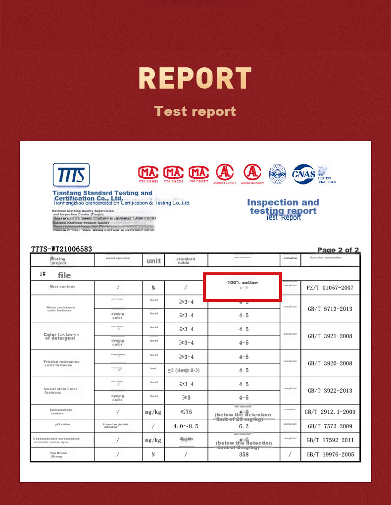 **Testing Standards:** FZ/T 01057-2007, GB/T 5713-2013, GB/T 3921-2008, GB/T 3920-2008, GB/T 3922-2013, GB/T 2912.1-2009, GB/T 7573-2009, GB/T 17592-2011, GB/T 19976-2005