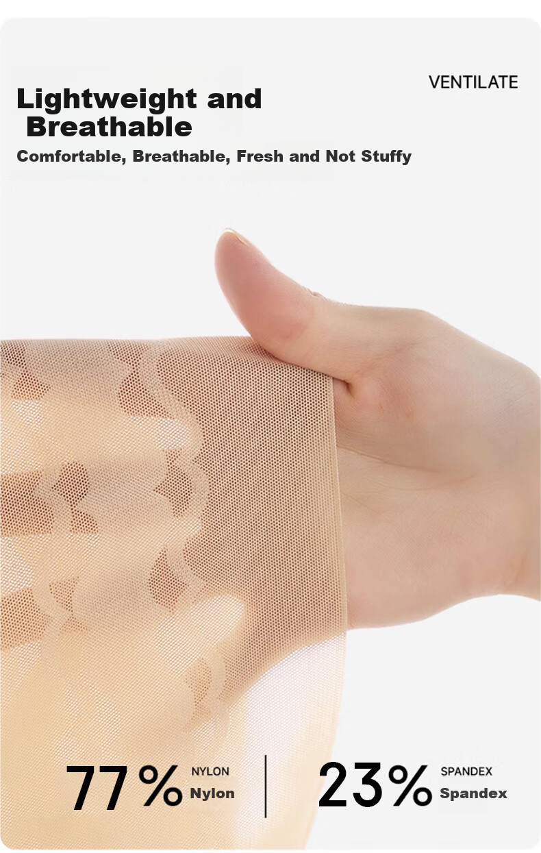 - Lace double-layered compression fabric with patterned pressure to tighten thighs and prevent riding up