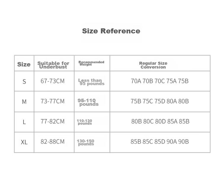 - **XL:** Underbust 82-88cm, Weight 130-150lbs, Fits 85B/85C/85D/90A/90B