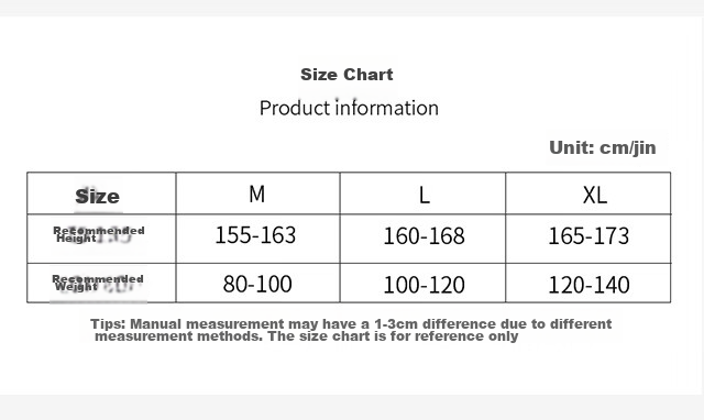 - XL: Recommended height 165-173cm, weight 120-140kg