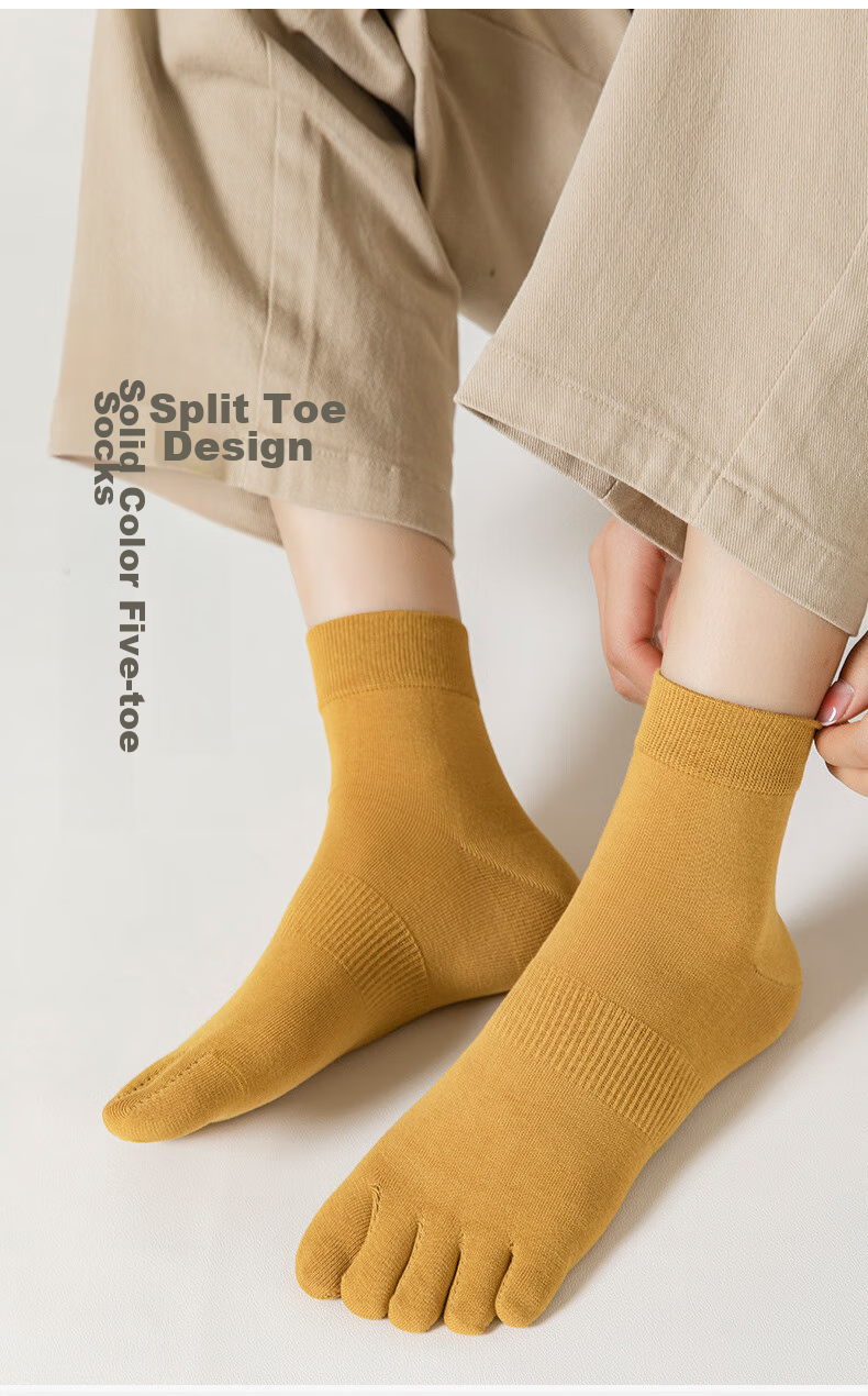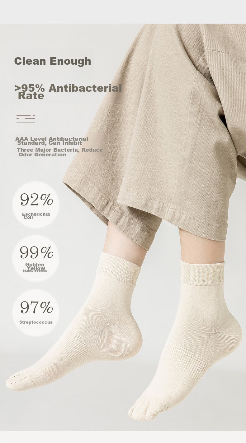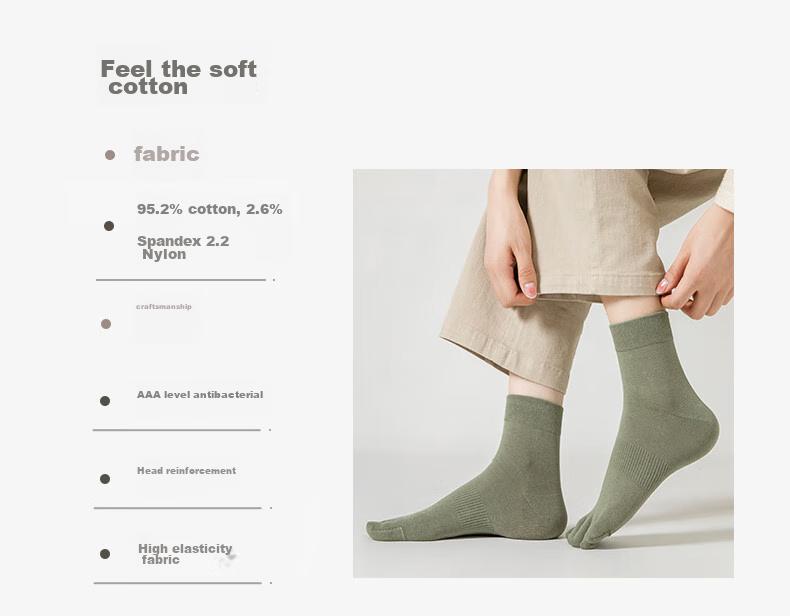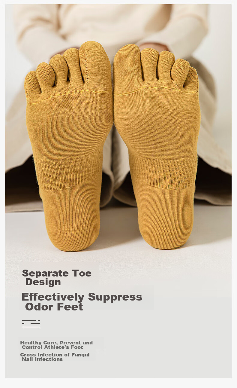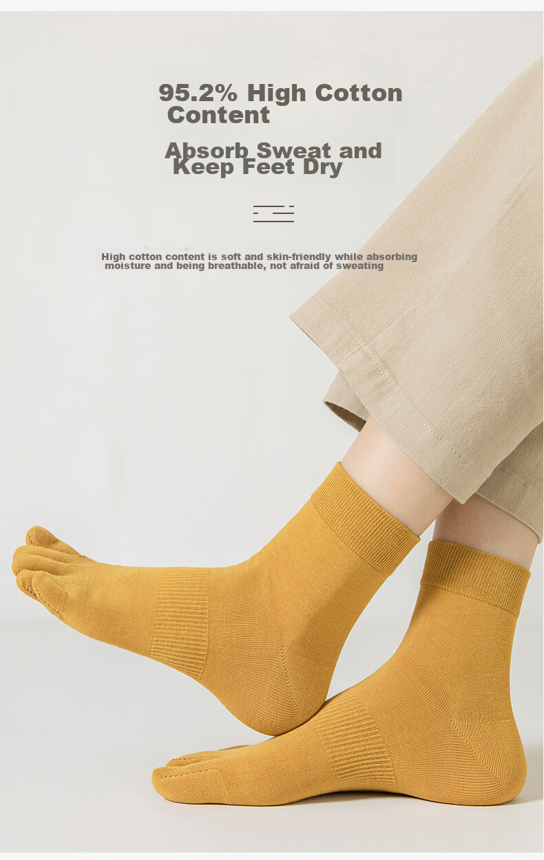 Feel the softness of 95.2% cotton, 2.6% spandex, and 2.2% nylon blend. These toe socks are designed with high elasticity and antibacterial properties, ensuring a comfortable and odor-free experience.