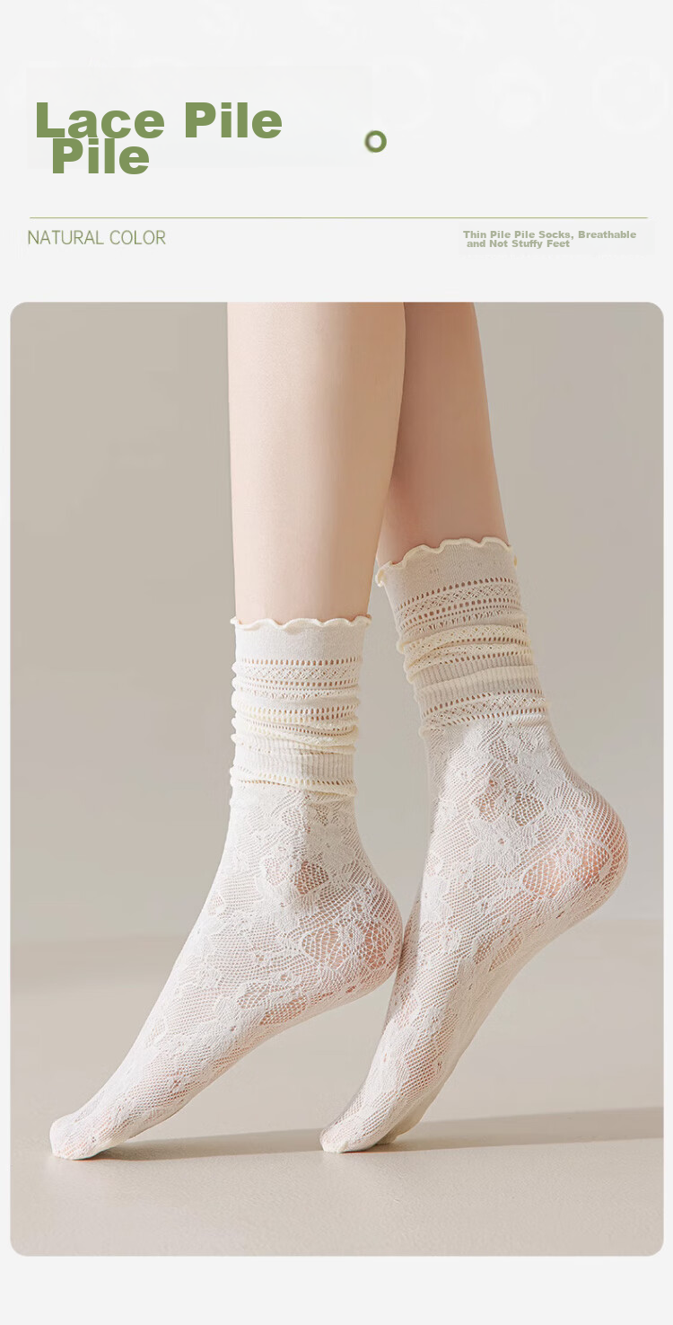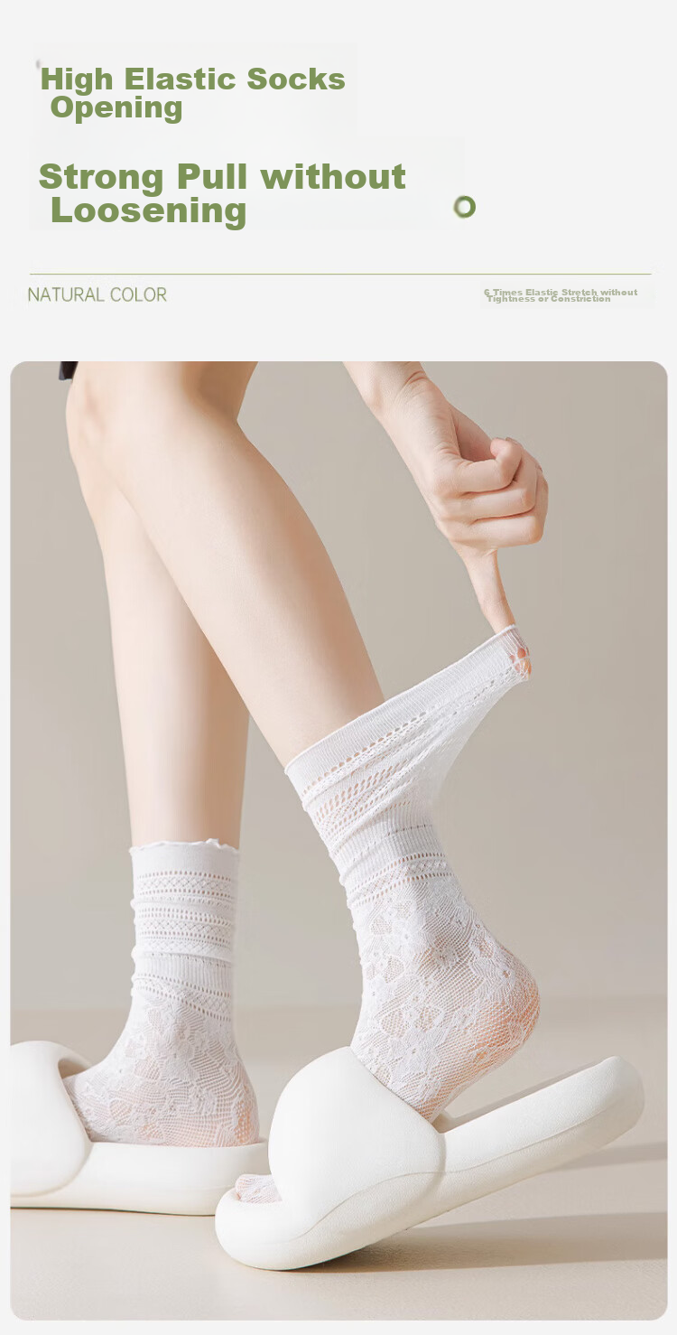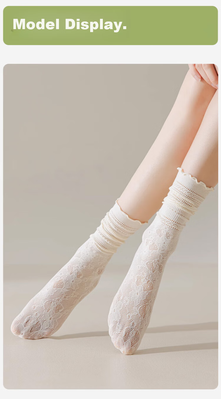 XUEXIMAN Women's Mid-Calf Stockings, White, Slouchy Style, Autumn Thin Breathable Mesh Socks with Lace Trim