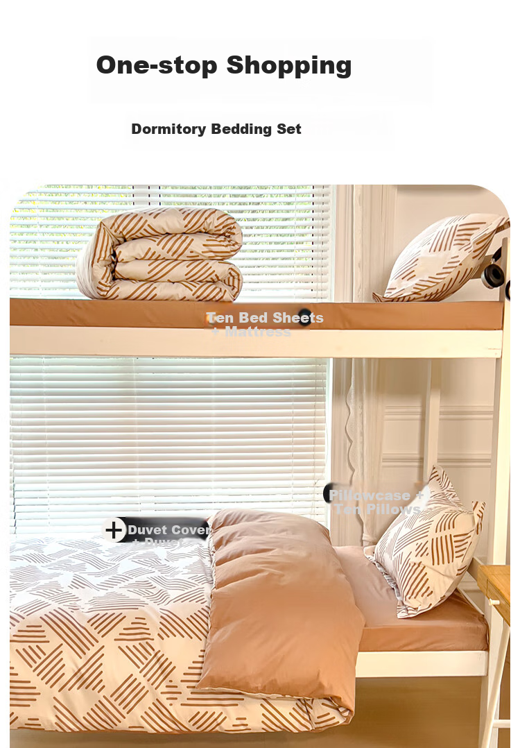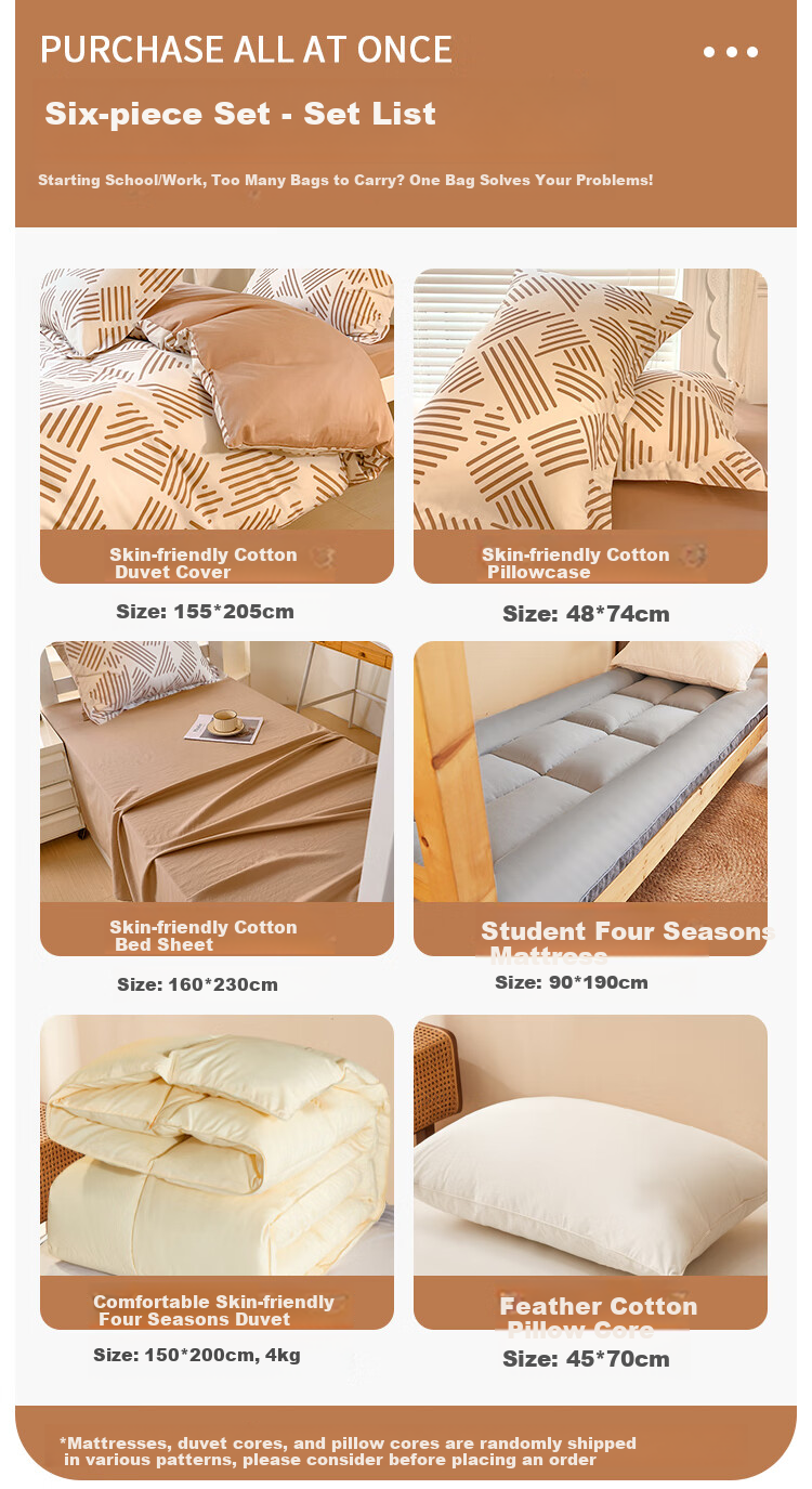 **Description:** Transform your dorm room into a cozy nest with the all-cotton dormitory six-piece set series. This set includes everything you need for your dorm bed: 1 bed sheet, 1 mattress cover, 2 pillowcases, 2 pillows, 1 duvet cover, and 1 duvet insert. Purchase all at once with this convenient set list, perfect for back-to-school or moving in hassle-free. The skin-friendly all-cotton duvet cover, pillowcases, and bed sheet come in dimensions of 155*205cm, 48*74cm, and 160*230cm respectively. The student-friendly four-season mattress cover measures 90*190cm, while the comfortable all-season duvet insert and feather cotton pillow inserts come in sizes of 150*200cm (4 pounds) and 45*70cm. Please note that the patterns on the mattress cover, duvet insert, and pillow inserts are randomly selected. Made from skin-friendly all-cotton fabric, this set offers a soft, high-density cotton touch that is delicate and gentle on the skin. Compared to regular fabrics, the fine and dense cotton yarn used in this set provides a more comfortable and soft feel. The material quality is top-notch, ensuring durability and comfort. This set is machine washable and colorfast, making laundry a breeze. However, it is recommended to only machine wash the duvet cover, bed sheet, and pillowcases, while the mattress cover, duvet insert, and pillow inserts should be aired regularly and not washed. Each set comes with matching pillowcases made from skin-friendly and soft all-cotton fabric.