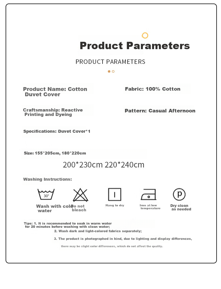 **Details:** Metal zipper for easy removal and washing, Comfortable and high-density fabric, Wide border design for pillowcases, Product Parameters: Cotton Duvet Cover, Fabric: 100% Cotton, Craft: Reactive Printing, Pattern: Leisure Afternoon, Specifications: 1 Duvet Cover, Sizes: 155*205cm, 180*220cm, 200*230cm, 220*240cm