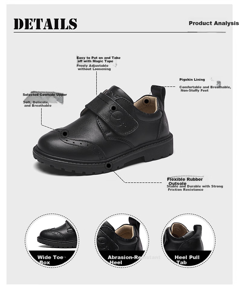 **Details:** Easy to put on and take off, adjustable magic sticker, pigskin lining for breathability, soft and breathable cowhide upper, reinforced heel pull tab