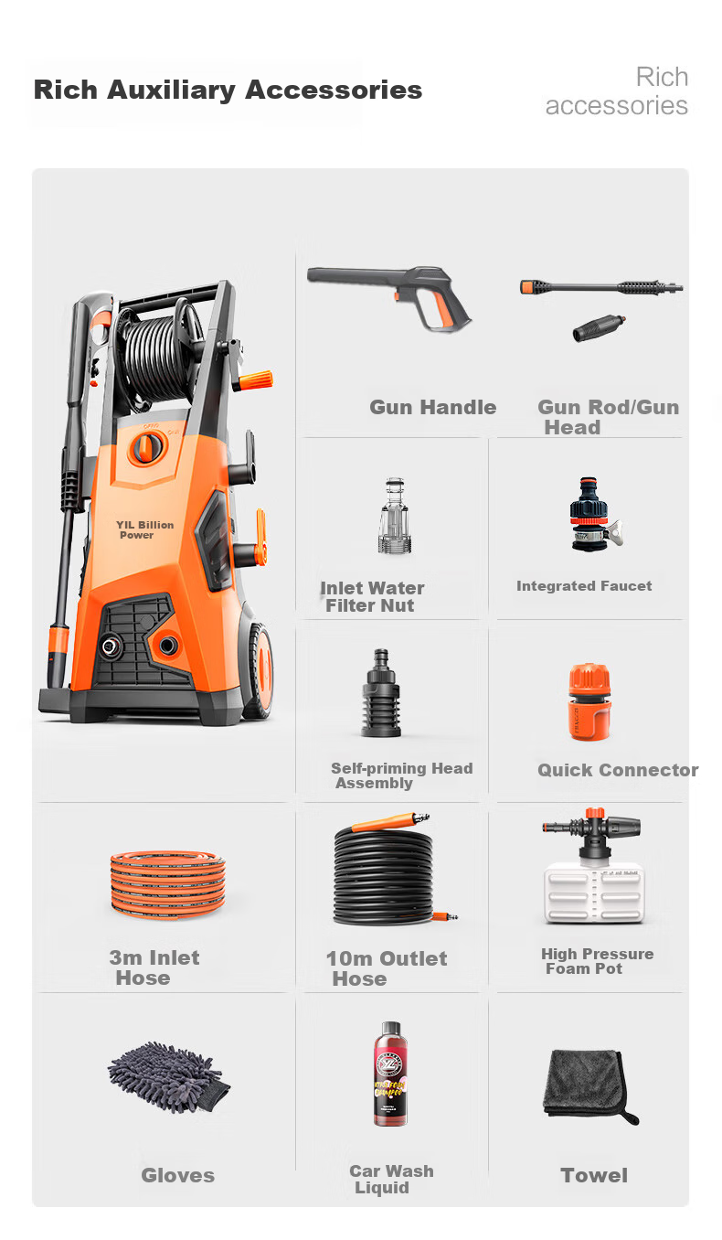 **Accessories:** High-pressure foam pot, gun handle, gun rod/nozzle, water inlet filter nut, integrated faucet, self-priming head assembly, quick connector, 3m inlet hose, 10m outlet hose, gloves, car wash liquid, towel