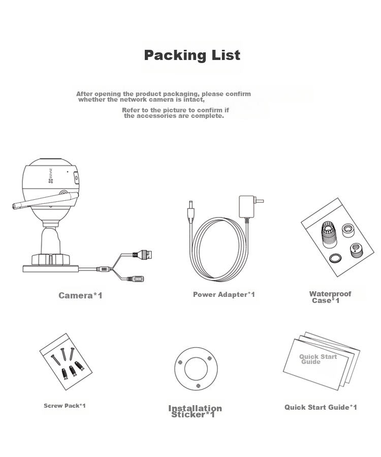 **Package Contents:** Camera, power adapter, waterproof kit, screws, installation stickers, quick start guide